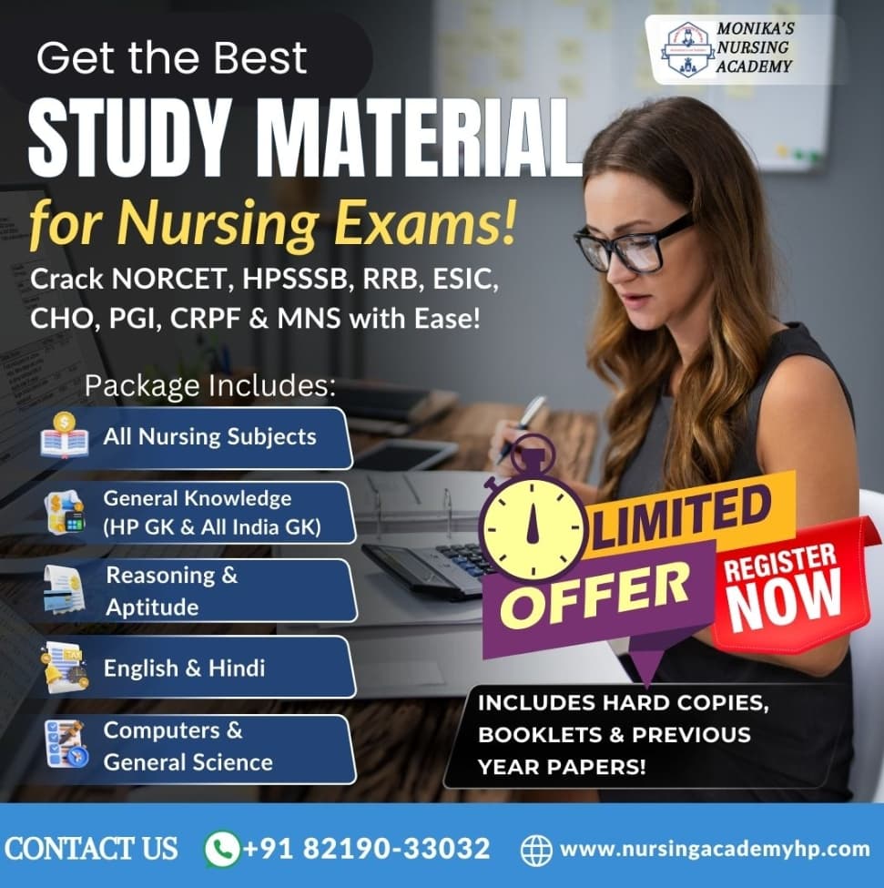 Fees: 4,100 Rs./ Only It will include all Nursing subjects chapter wise notes and their question papers. All India Gk, Himachal Gk English, Computers, reasoning Aptitude, Hindi, Notes as well as question papers Included. All Previous 5 years Entrance paper of NORCET, HPSSB, PGI Chd. RRB, ESIC, And Jammu And Kashmir, JKSSB and Military Nursing